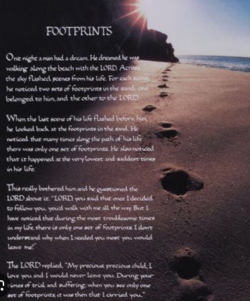 I told this story to some AA friends, and my boy Ricky said, “That’s like the footprints in the sand. You only left one set of tracks cause God was carrying you on your back.”