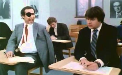 Look at the time and effort Fitz-Hume puts into cheating. The manuscript he is chewing on is my favorite gimmick. This scene edges out Fast Times for my favorite test cheating moment of my youth.